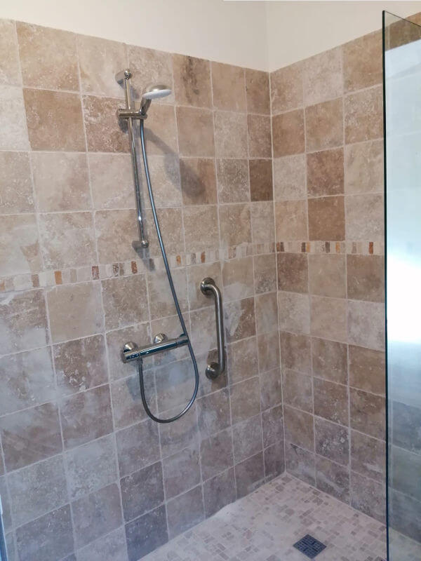 De badkamer heeft een uitklapbare steun tussen het toilet en de verlaagde wastafel en een handgreep aan de wand in de inrol-douche. De douche is ruim genoeg voor 2 personen voor het geval hulp nodig is bij het wassen. Er is een douche- en toiletstoel aanwezig.